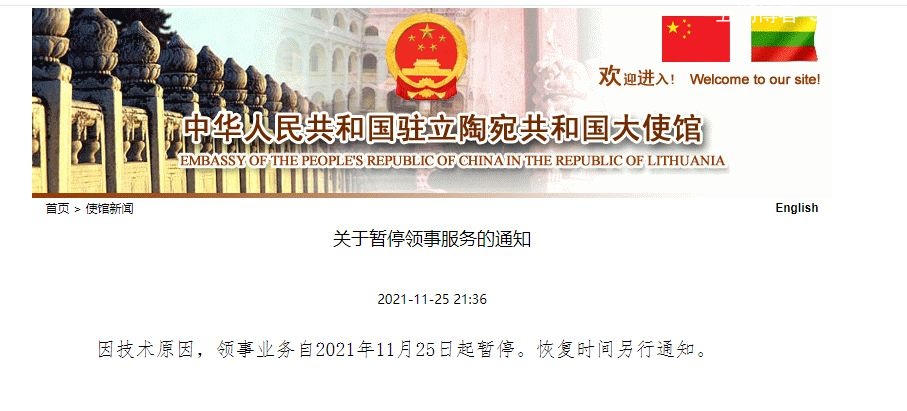 中国驻立陶宛大使馆网站25日消息,因技术原因,领事业务自2021年11月25日起暂停。恢复时间另行通知。